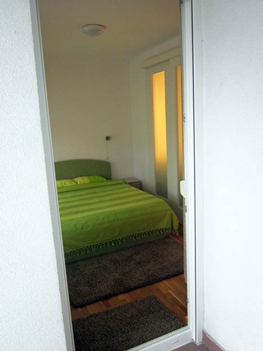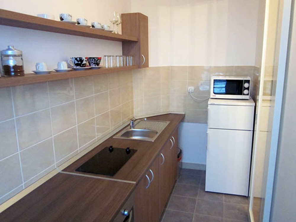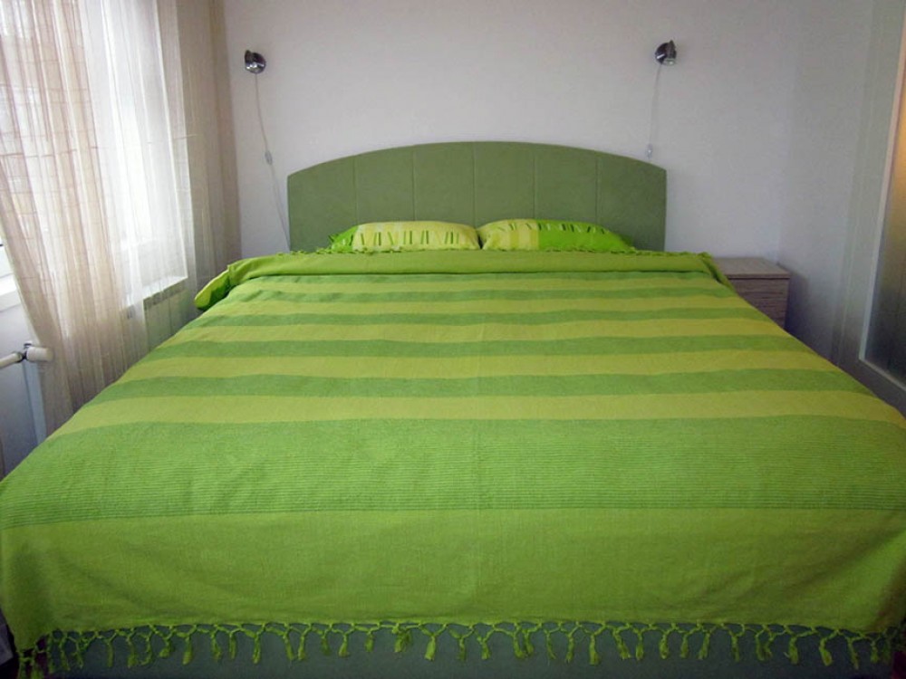 Apartman obiluje toplim bojama i sadrži dnevni boravak u čijem sklopu je trpezarija. U dnevnoj sobi je lepa ugaona garnitura na rasklapanje, pa uz bračni ležaj u spavaćoj sobi u apartmanu komotno boravi četvoro (dva para). Iz spavaće sobe izlazi se na terasu na kojoj se nalazi garniture za sedenje. Kuhinja je prirodno osvetljena, odvojena vratima od dnevne sobe i potpuno opremljena. Kupatilo je takođe dosta prostrano, sa kadom i veš mašinom. Plakar za stvari nalazi se u spavaćoj i dnevnoj sobi.