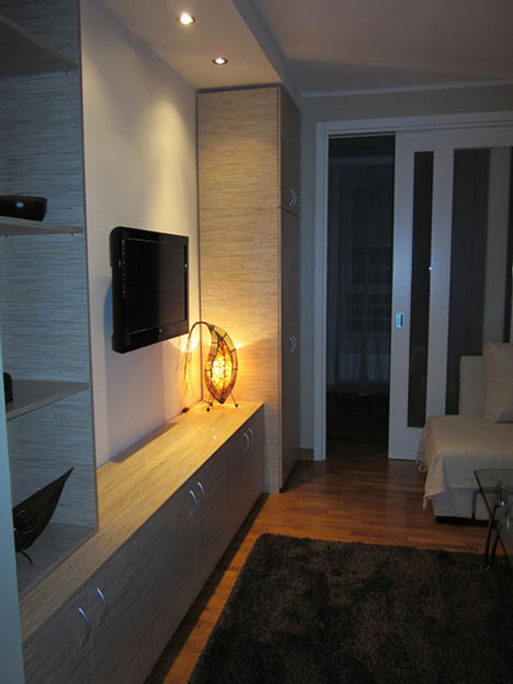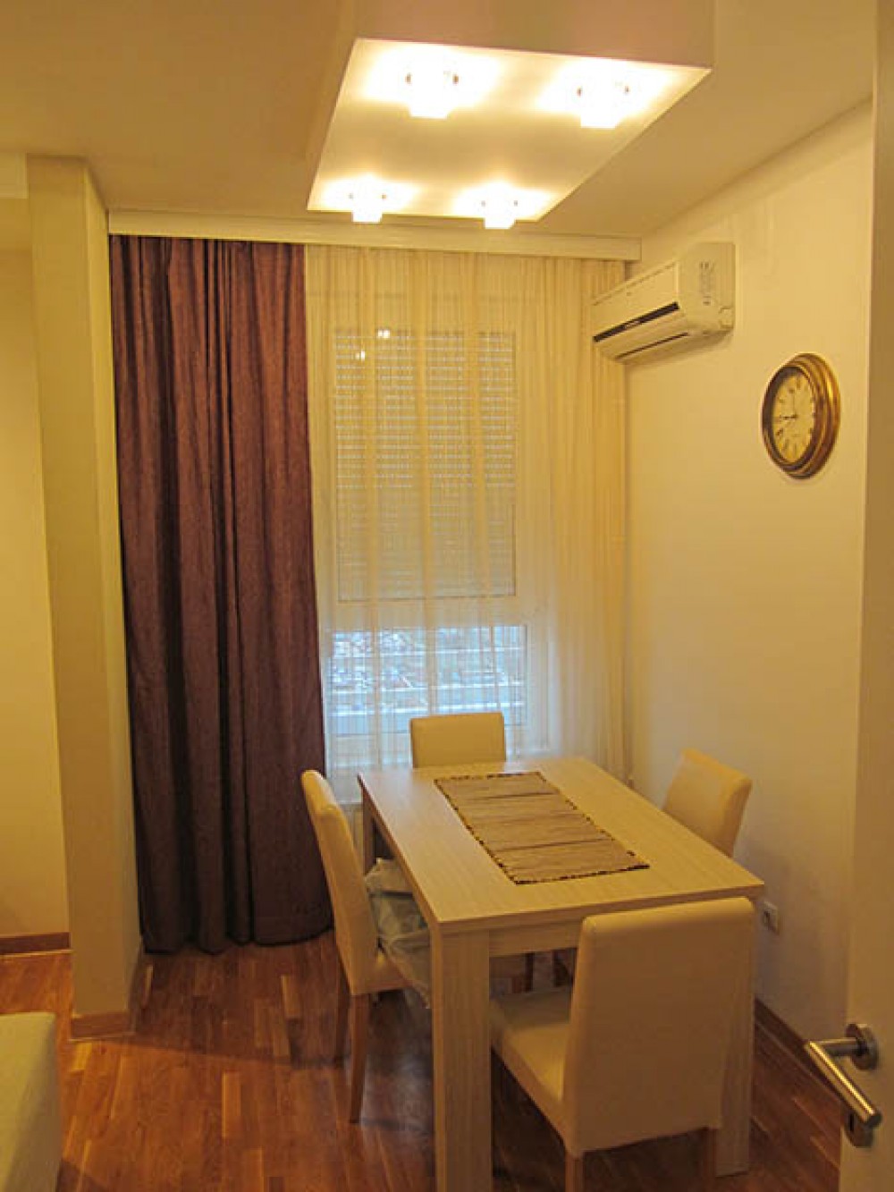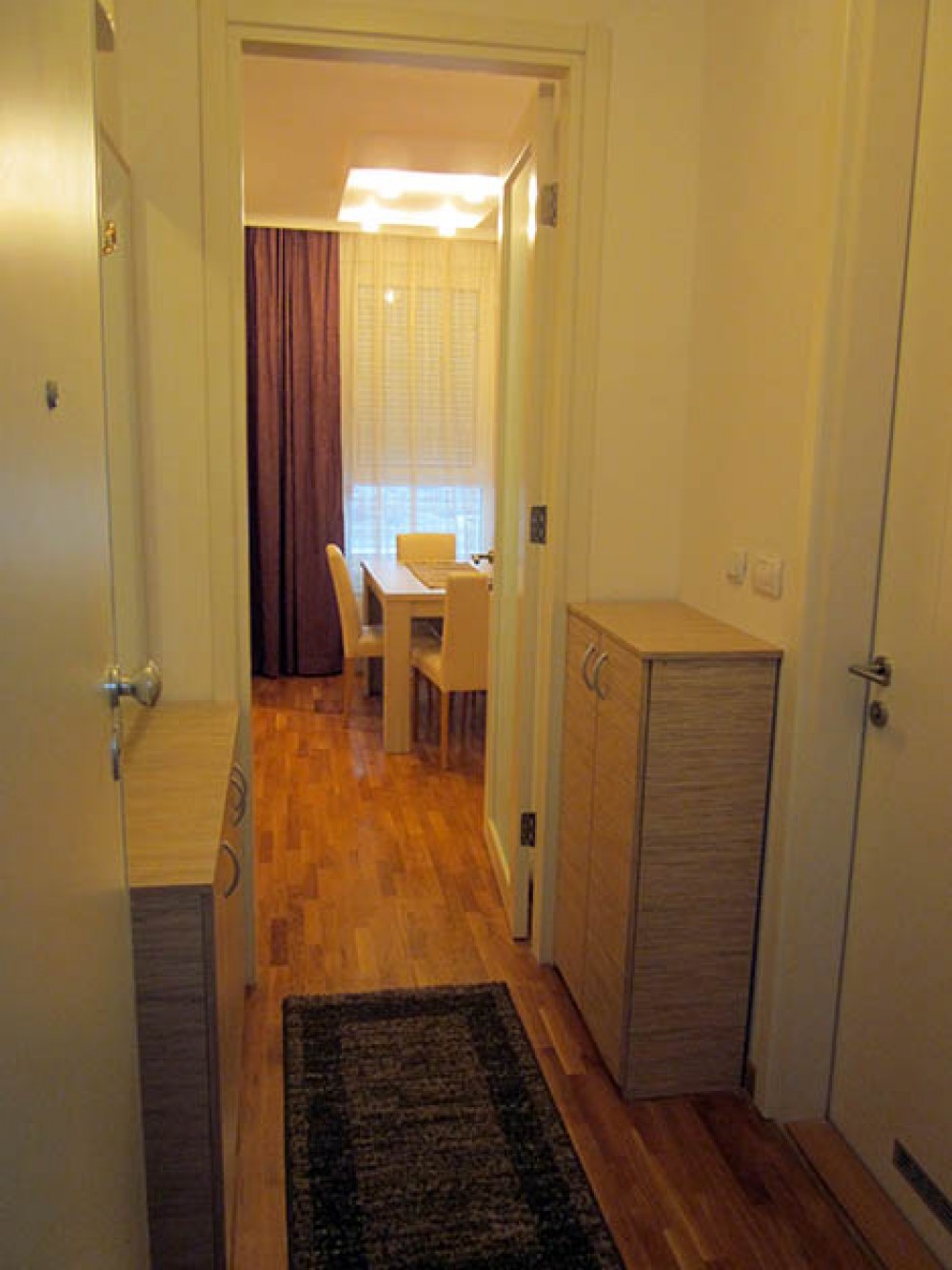 Apartman obiluje toplim bojama i sadrži dnevni boravak u čijem sklopu je trpezarija. U dnevnoj sobi je lepa ugaona garnitura na rasklapanje, pa uz bračni ležaj u spavaćoj sobi u apartmanu komotno boravi četvoro (dva para). Iz spavaće sobe izlazi se na terasu na kojoj se nalazi garniture za sedenje. Kuhinja je prirodno osvetljena, odvojena vratima od dnevne sobe i potpuno opremljena. Kupatilo je takođe dosta prostrano, sa kadom i veš mašinom. Plakar za stvari nalazi se u spavaćoj i dnevnoj sobi.